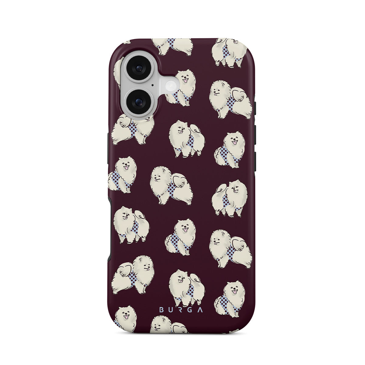 This design features: white fluffy dogs on a deep burgundy background, poodles, pets.