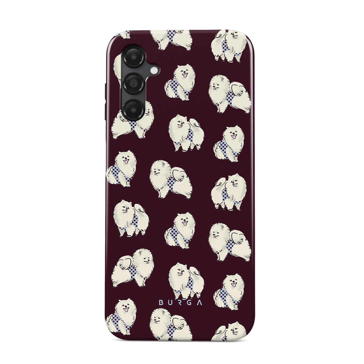 This design features: white fluffy dogs on a deep burgundy background, poodles, pets.