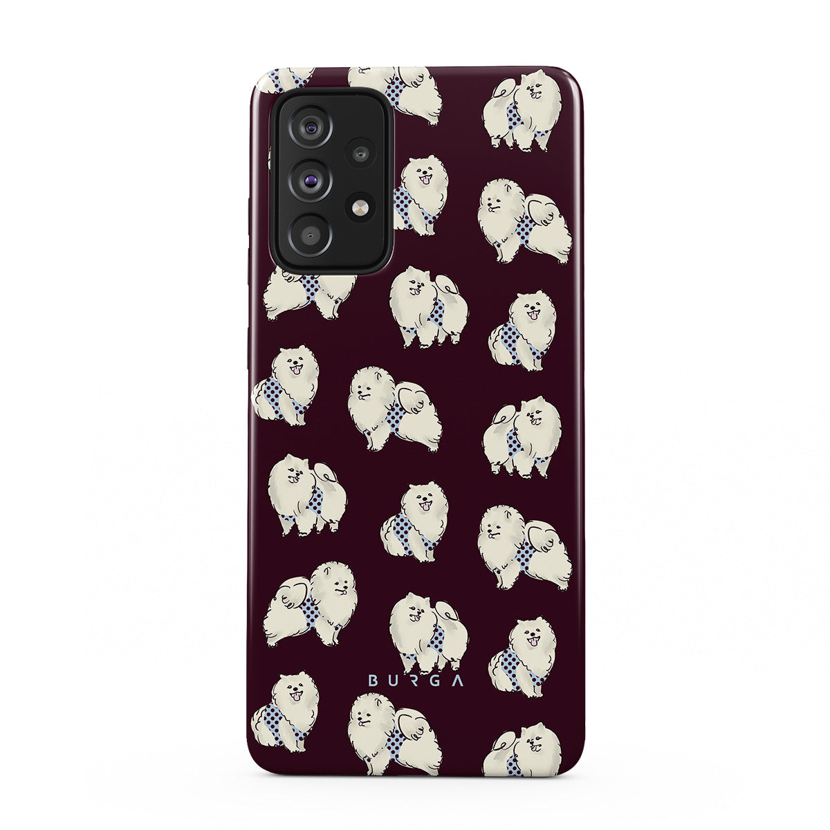 This design features: white fluffy dogs on a deep burgundy background, poodles, pets.