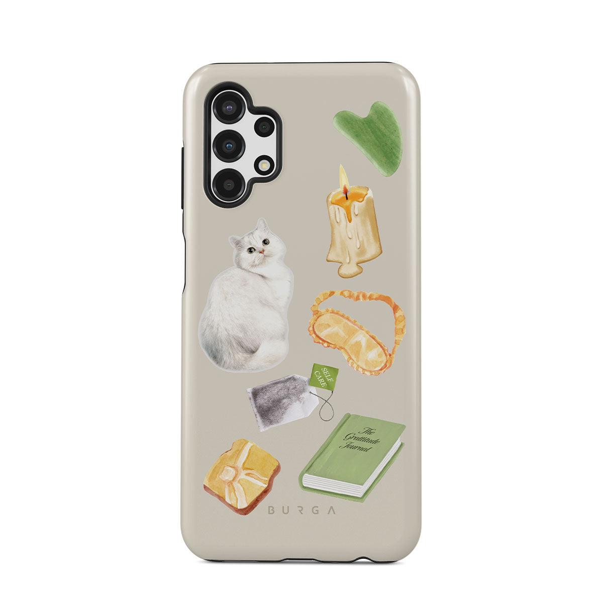 This design features: white cat, green book, candle, Gua Sha bar, sleeping mask, tea bag, yellow crystal