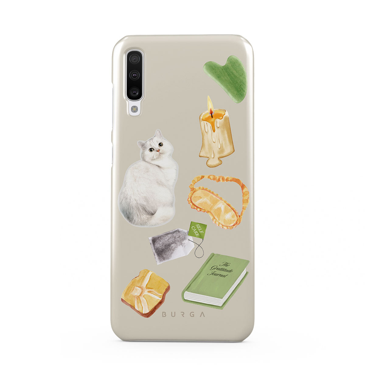 This design features: white cat, green book, candle, Gua Sha bar, sleeping mask, tea bag, yellow crystal