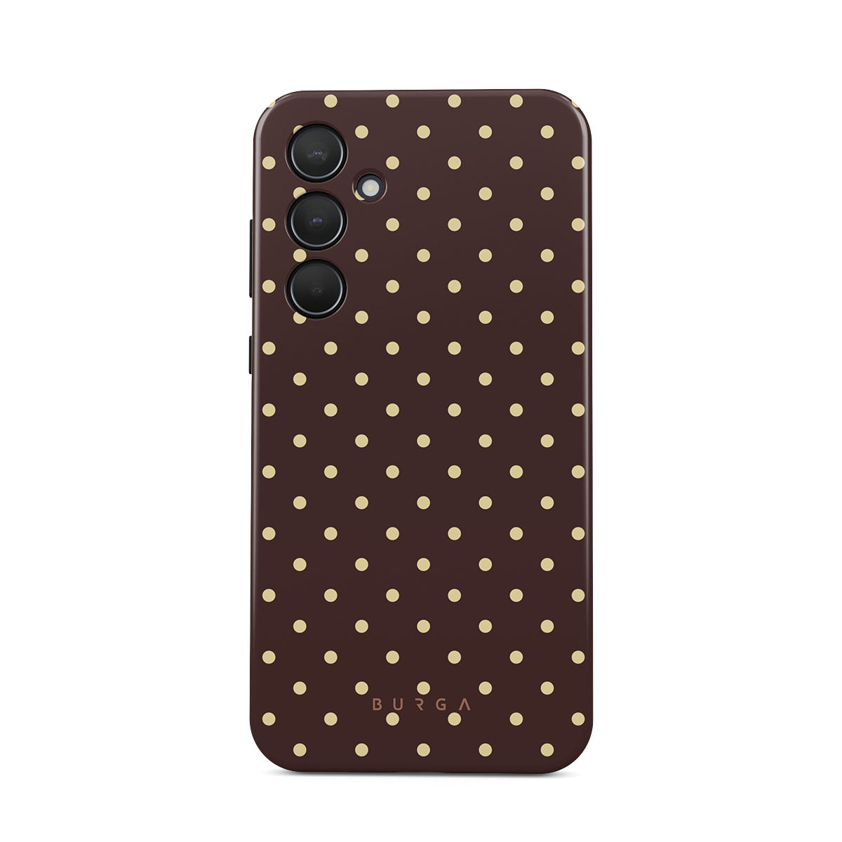Playful yet polished, our Sorry Busy Samsung Galaxy A35 phone case design features a warm brown background sprinkled with delicate beige polka dots, blending charm with a professional edge. It's for those who keep it stylish, even when fully booked and thriving.