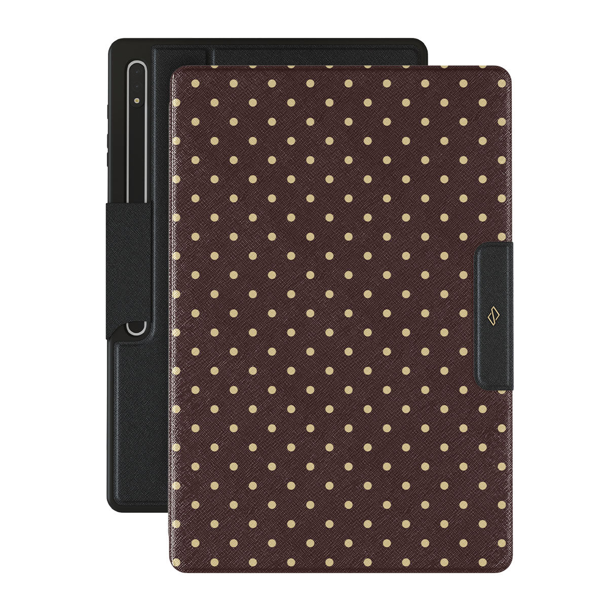 Playful yet polished, our Sorry Busy Samsung Galaxy Tab S8 Ultra folio case design features a warm brown background sprinkled with delicate beige polka dots, blending charm with a professional edge. It's for those who keep it stylish, even when fully booked and thriving.