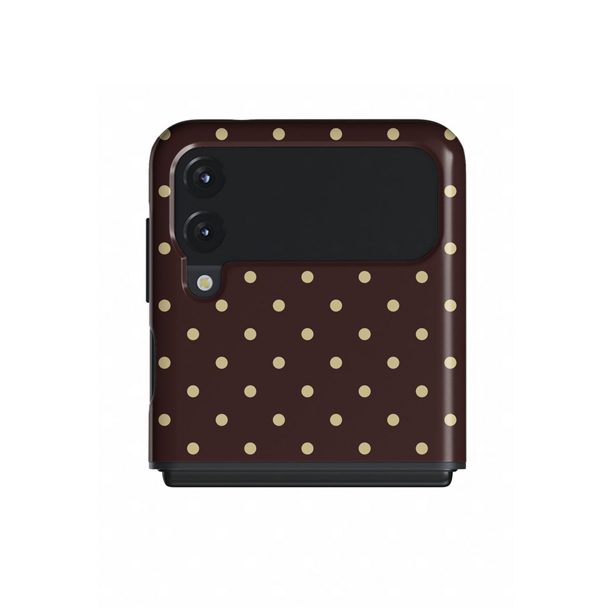 Playful yet polished, our Sorry Busy Samsung Galaxy Z Flip 3 phone case design features a warm brown background sprinkled with delicate beige polka dots, blending charm with a professional edge. It's for those who keep it stylish, even when fully booked and thriving.