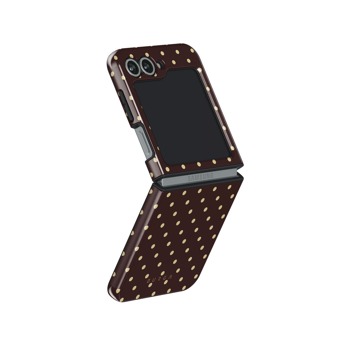 Playful yet polished, our Sorry Busy Samsung Galaxy Z Flip 6 phone case design features a warm brown background sprinkled with delicate beige polka dots, blending charm with a professional edge. It's for those who keep it stylish, even when fully booked and thriving.
