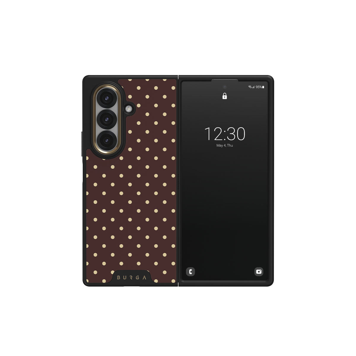 Playful yet polished, our Sorry Busy Samsung Galaxy Z Fold 7 phone case design features a warm brown background sprinkled with delicate beige polka dots, blending charm with a professional edge. It's for those who keep it stylish, even when fully booked and thriving.