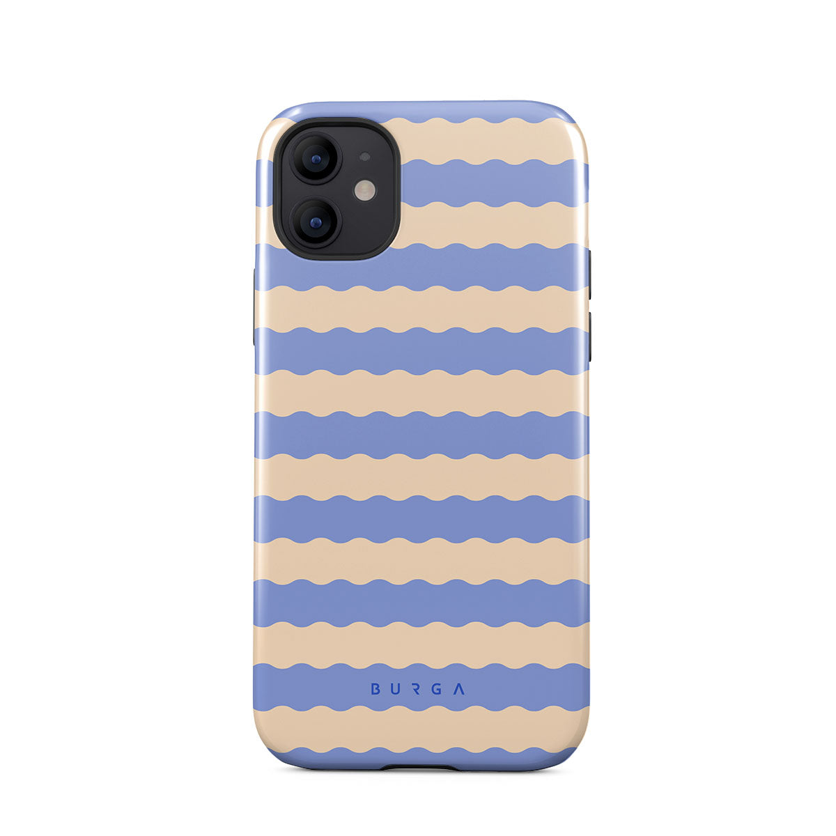 Dive into the cool, refreshing style of our Splash design–a dynamic iPhone 12 phone case featuring playful, wavy stripes of serene ocean blue and soft sandy beige. Perfect for those who love to make a splash with their accessories.