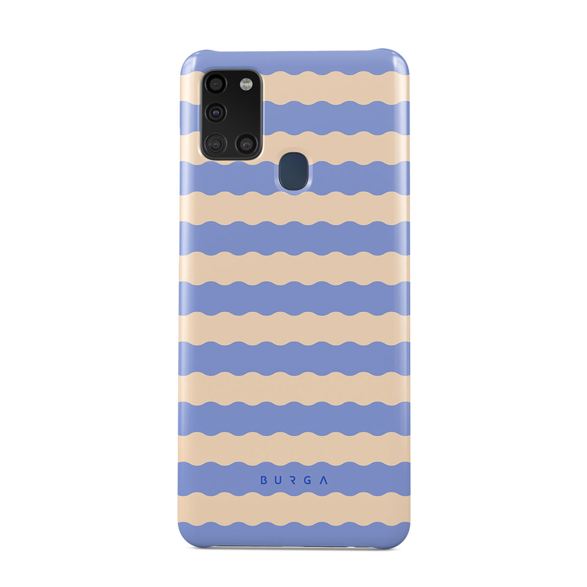 Dive into the cool, refreshing style of our Splash design–a dynamic Samsung Galaxy A21s 4G phone case featuring playful, wavy stripes of serene ocean blue and soft sandy beige. Perfect for those who love to make a splash with their accessories.