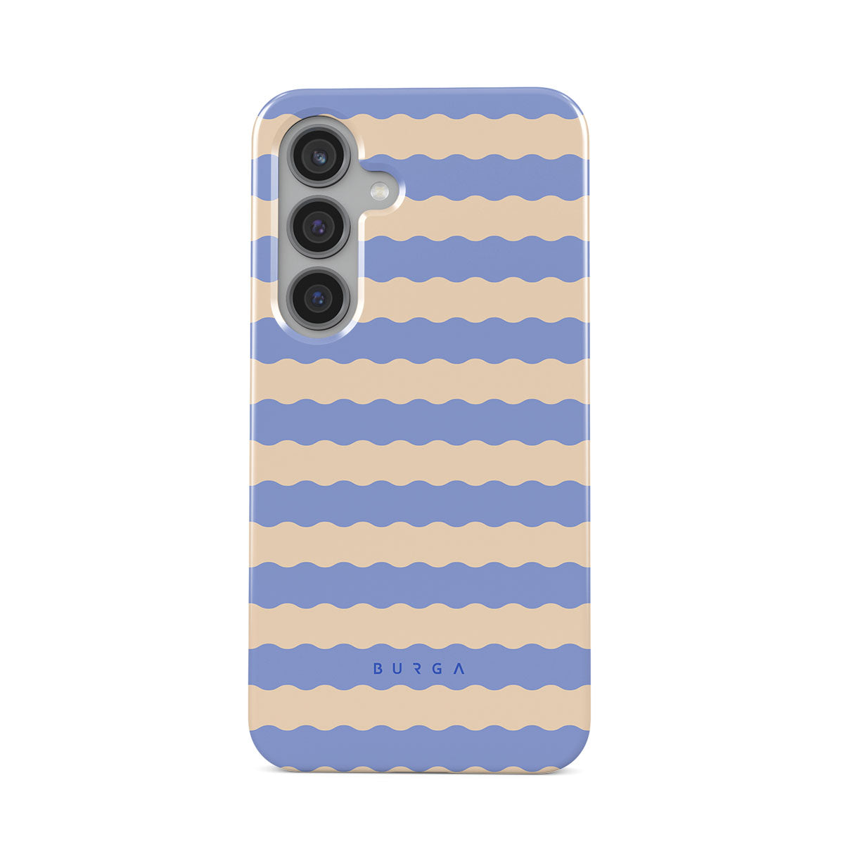 Dive into the cool, refreshing style of our Splash design–a dynamic Samsung Galaxy S24 FE phone case featuring playful, wavy stripes of serene ocean blue and soft sandy beige. Perfect for those who love to make a splash with their accessories.