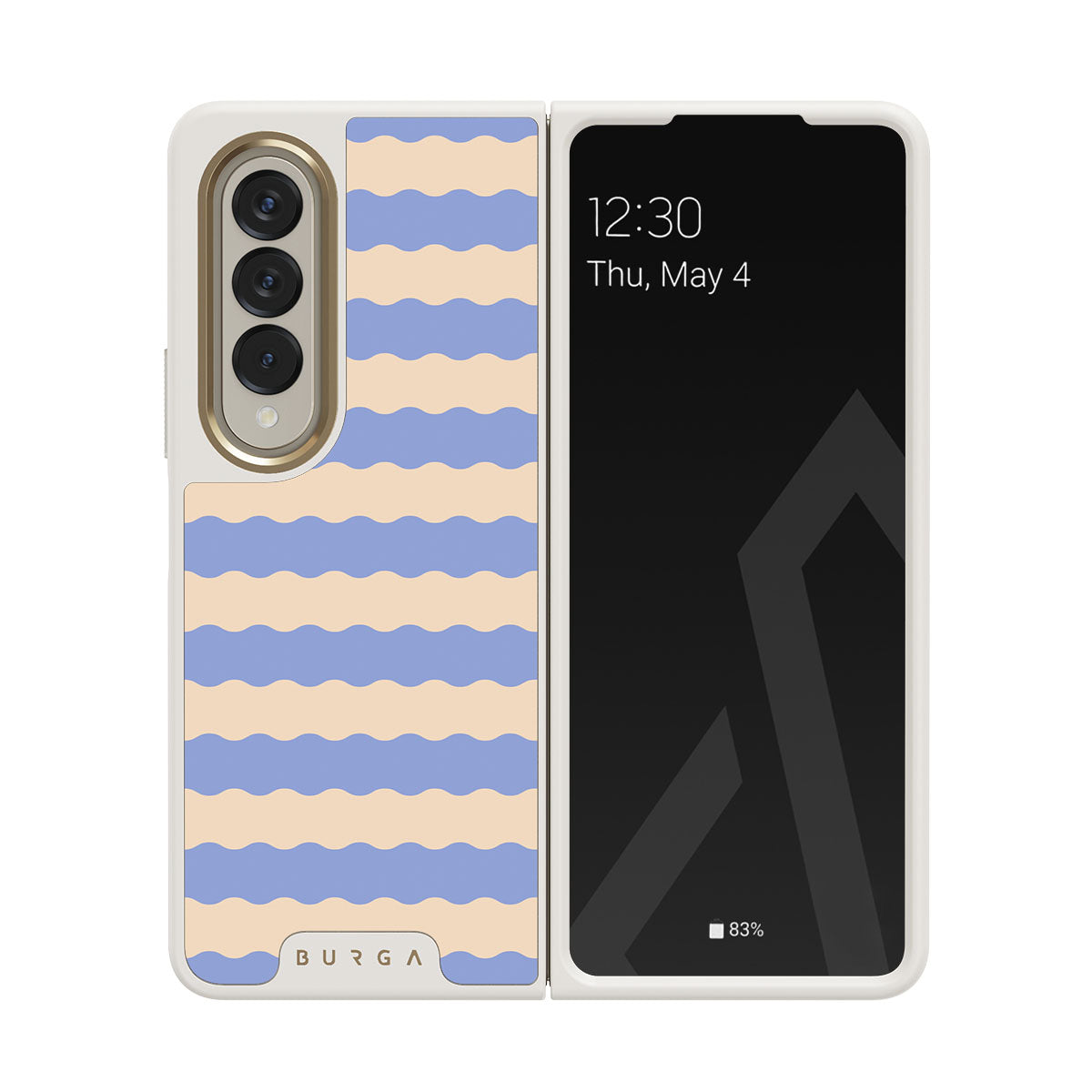 Dive into the cool, refreshing style of our Splash design–a dynamic Samsung Galaxy Z Fold 4 phone case featuring playful, wavy stripes of serene ocean blue and soft sandy beige. Perfect for those who love to make a splash with their accessories.