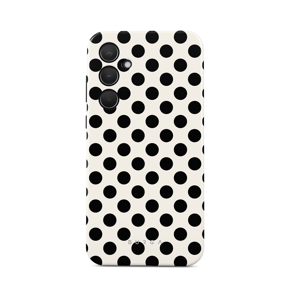This design features: black polka dots on a clean white background.