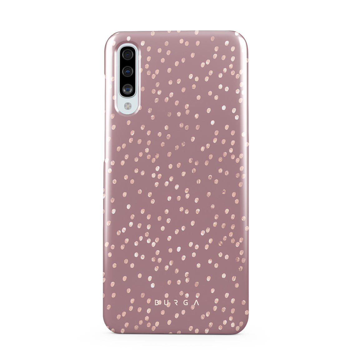 Trendy mauve color as a background for the gold-colored spots creates true beauty. Make your Samsung Galaxy A50 stand out with our protective and pretty Hot Cocoa phone case. The spotted pattern adds a touch of luxury to your phone, while the case's hard-shell nature offers much-needed protection.