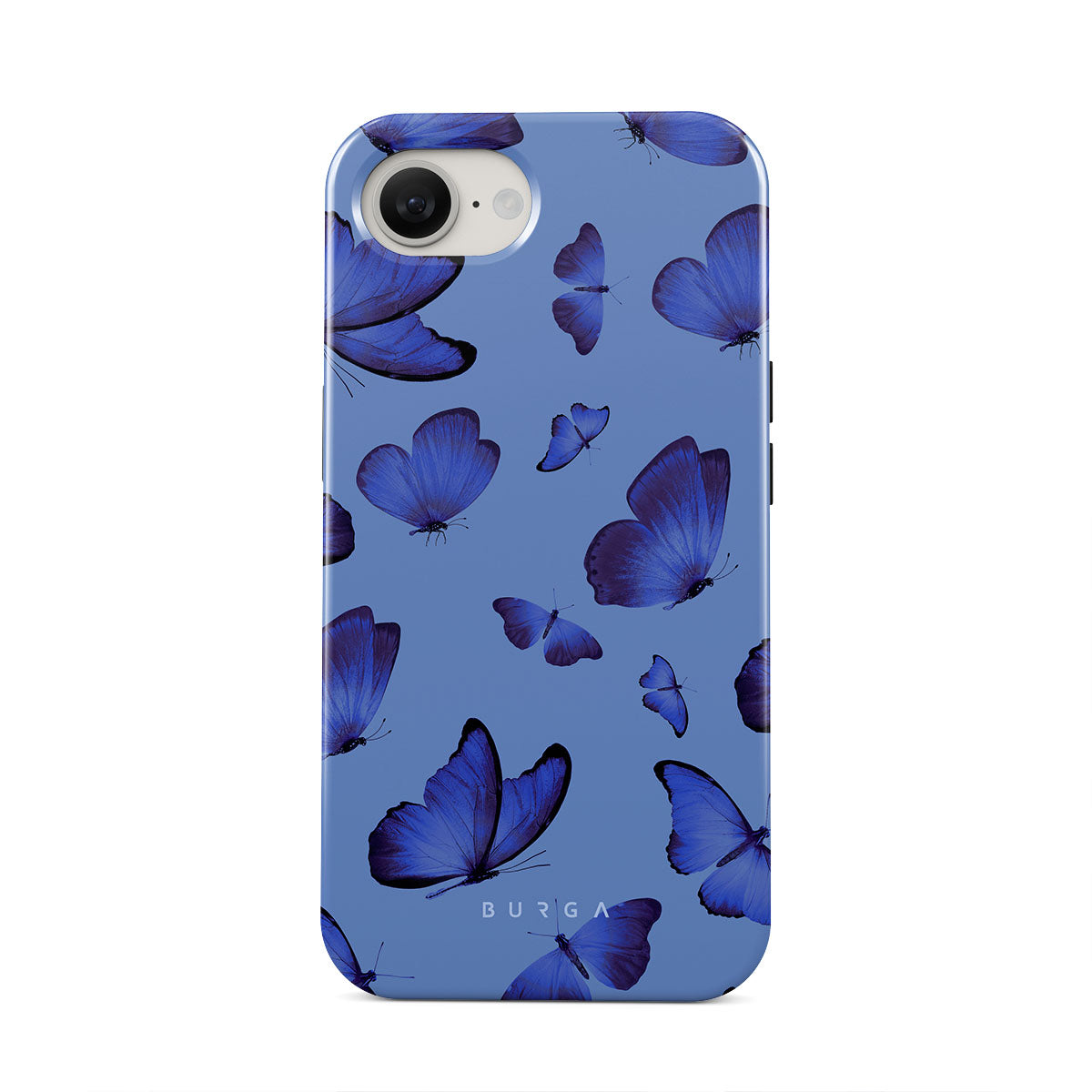 Bright blue butterflies dance across a sky-blue expanse, a visual representation of freedom and transformation. Our Spring Court iPhone 16e phone case design symbolizes the soul's eternal dance with change, each flutter a step towards becoming who we are meant to be.