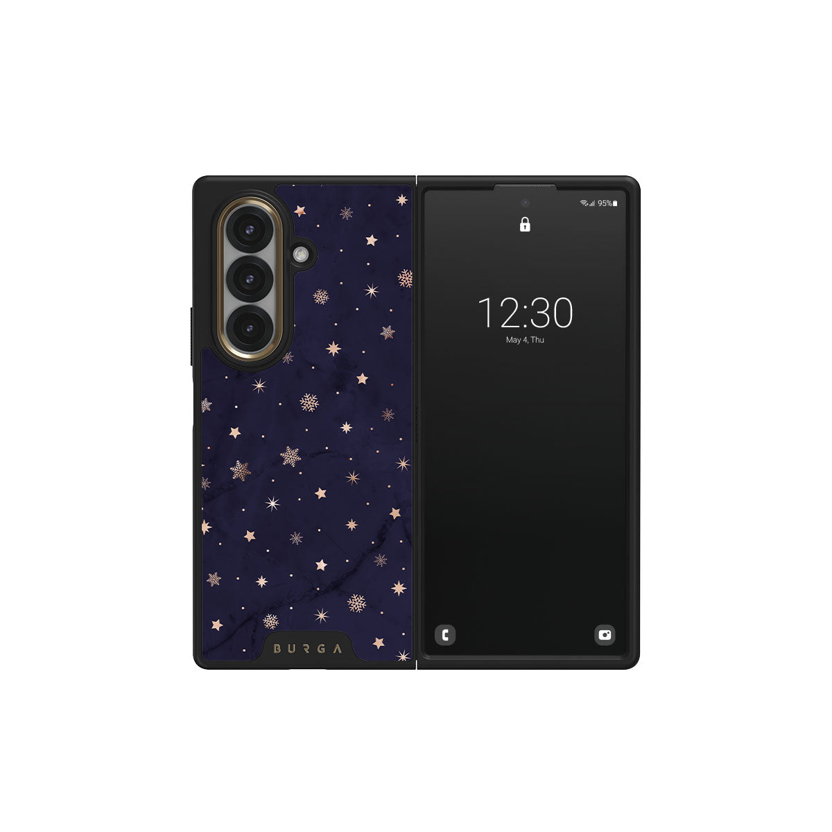 With a dreamy combination of dark blue and golden colors in the pretty star pattern found in our Midnight Kiss Samsung Galaxy Z Fold 7 phone case, you can protect your phone and add a magical feel to it just in one go.