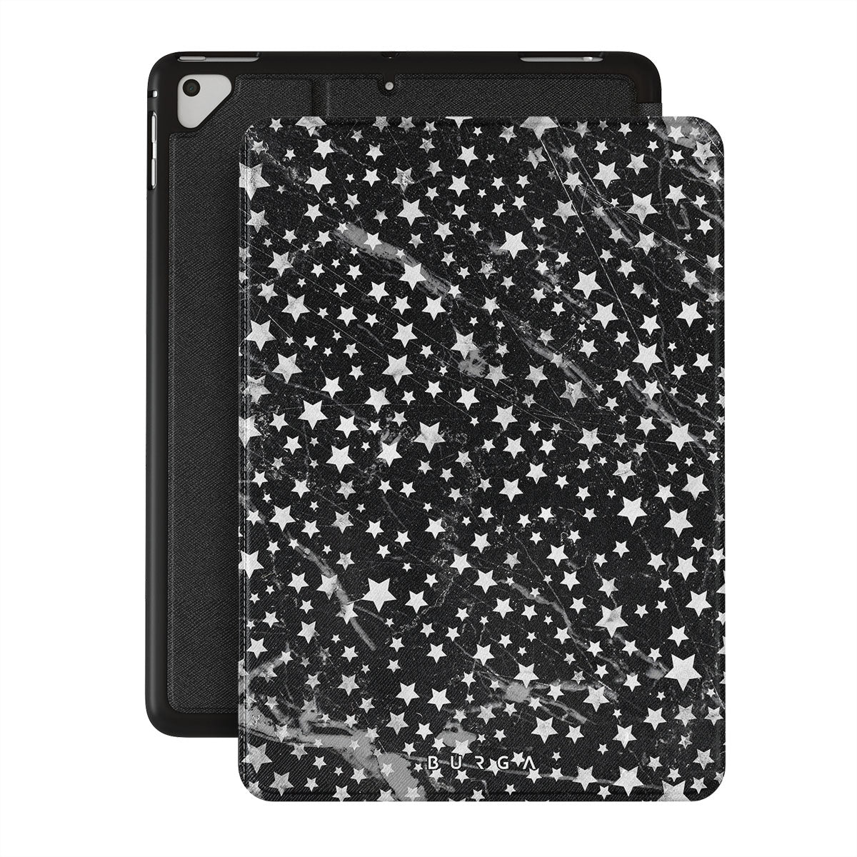 Dark, endless with flickering stars, the Starry Night iPad 9.7 (6th/5th Gen) folio case is inspired by the sky above us. Here the charming star pattern meets with a trendy black and white marble. Add the unique combination to your wardrobe and transform your protective iPad case cover into a fashion accessory.
