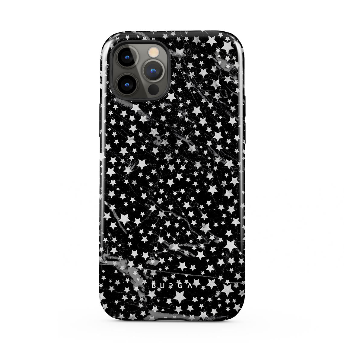 iPhone 12 Pro phone case is inspired by the sky above us. Here the charming star pattern meets with a trendy black and white marble. Add the unique combination to your wardrobe and transform your protective phone case into a fashion accessory.