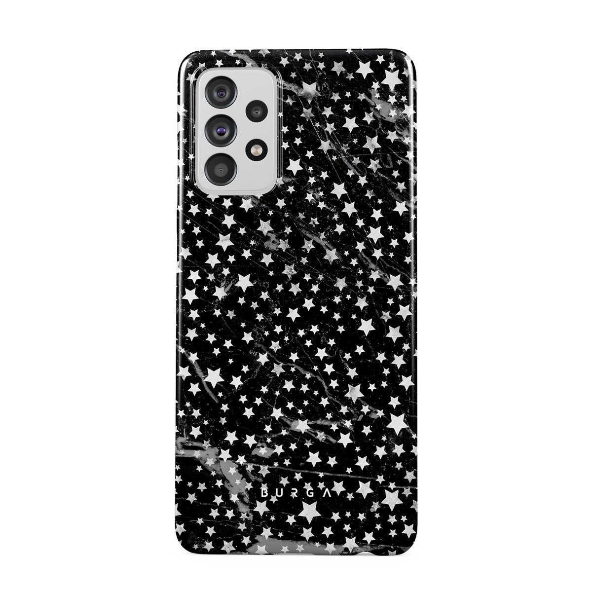 Samsung Galaxy A72 phone case is inspired by the sky above us. Here the charming star pattern meets with a trendy black and white marble. Add the unique combination to your wardrobe and transform your protective phone case into a fashion accessory.