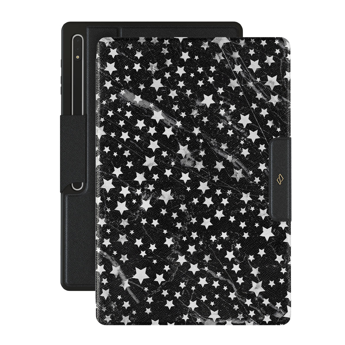 Dark, endless with flickering stars, the Starry Night Samsung Galaxy Tab S10 Ultra folio case is inspired by the sky above us. Here the charming star pattern meets with a trendy black and white marble. Add the unique combination to your wardrobe and transform your protective Galaxy Tab case cover into a fashion accessory.