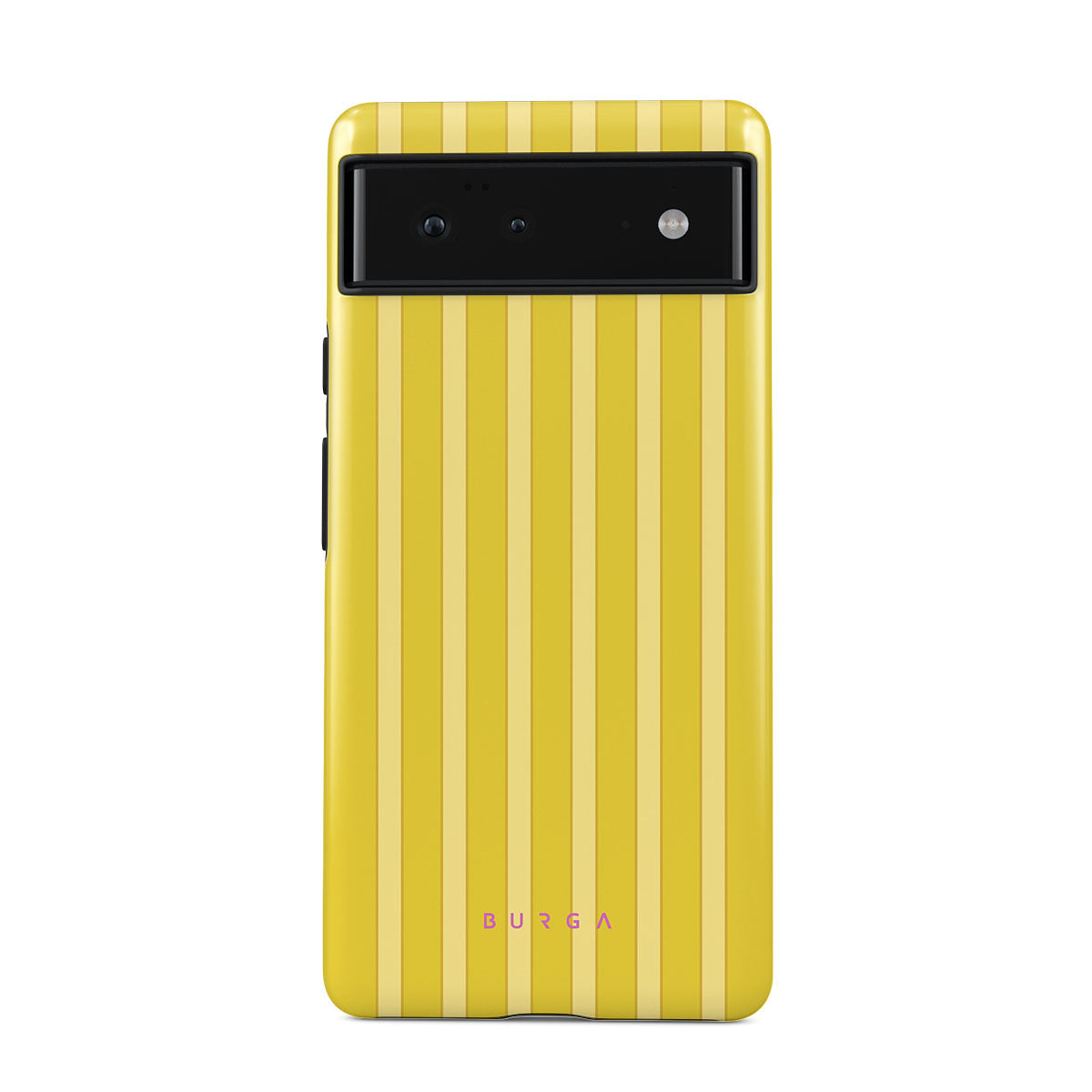 Bask in the glow of Sunbreak. This Google Pixel 6 Pro phone case design features bold yellow stripes, reminiscent of beachside cabanas and sunny summer days. It’s a chic celebration of joy and simplicity.