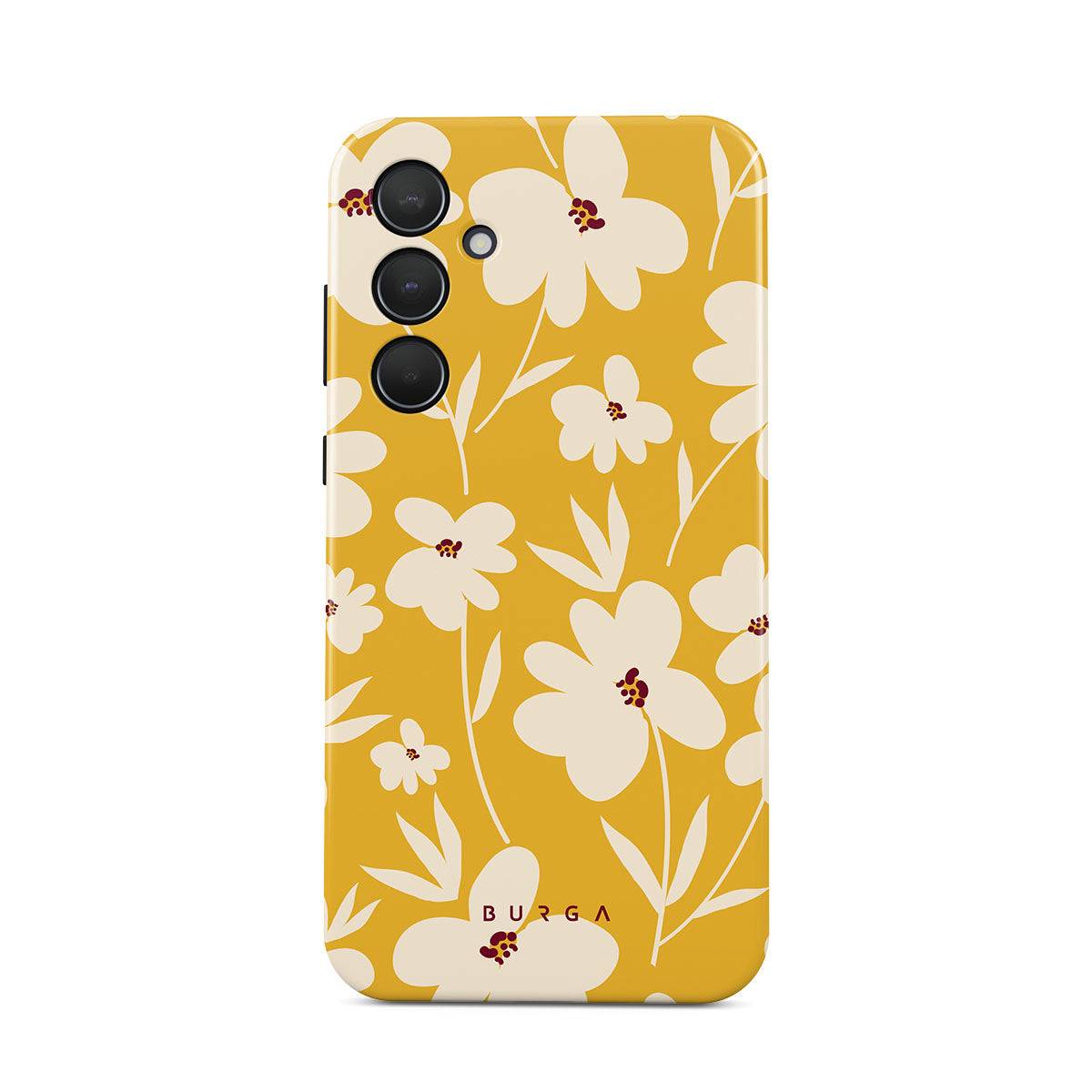 Full of fresh produce, warm rays of sunshine, and relaxing moments, our Sunday Market Samsung Galaxy A35 phone case encase all of this! The vintage mustard-yellow background with beautiful creme flowers will add that soft floral touch to your wardrobe while protecting your device from unexpected falls!