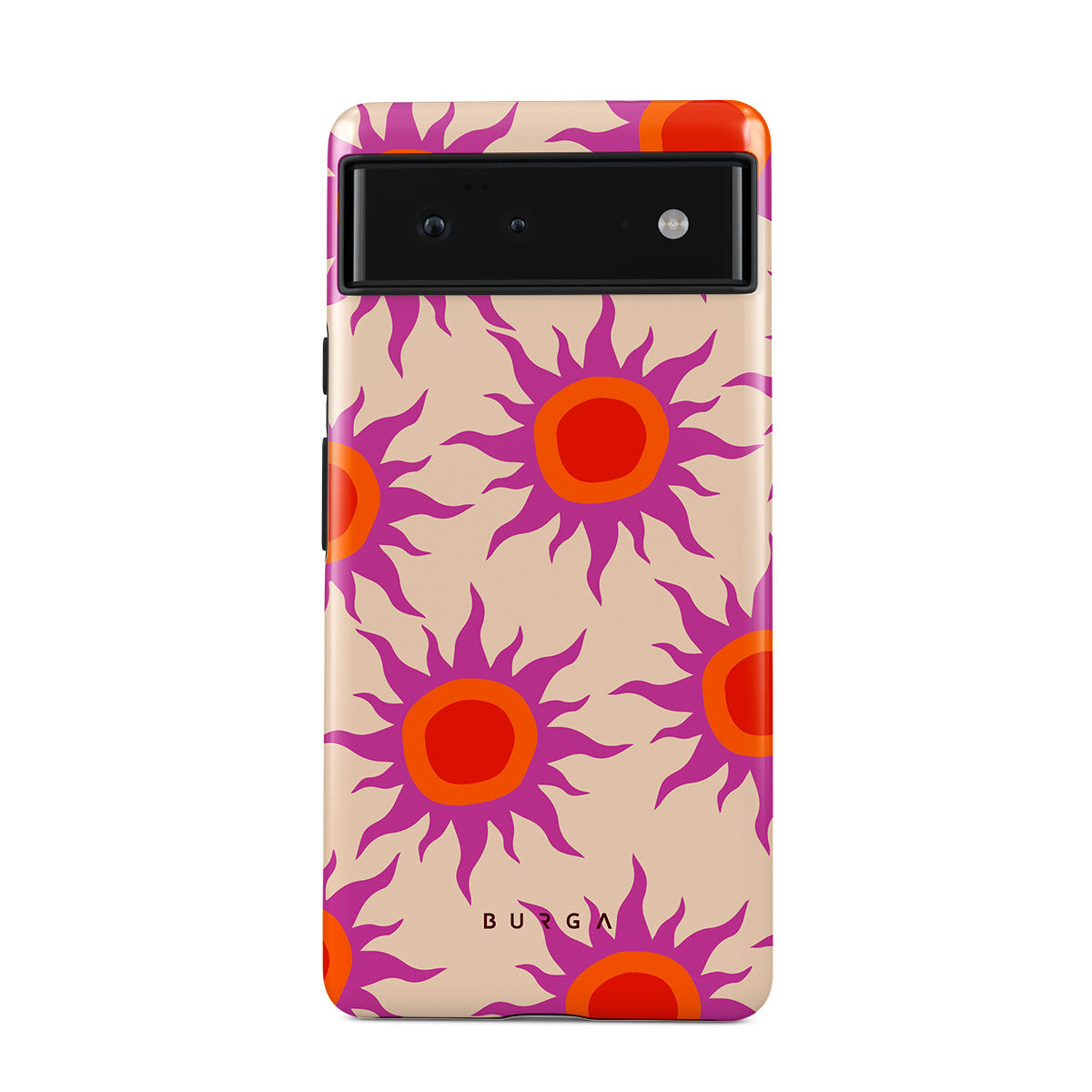 Discover the radiant serenity of the Sunset Glow design, a harmonious blend of soothing pastels and fiery suns. Vivacious viva magenta rays add a playful touch, perfectly balancing tranquility and dynamism. More than just a fashion accessory, this striking Google Pixel 6a phone case mirrors your unique personality and zest for life.
