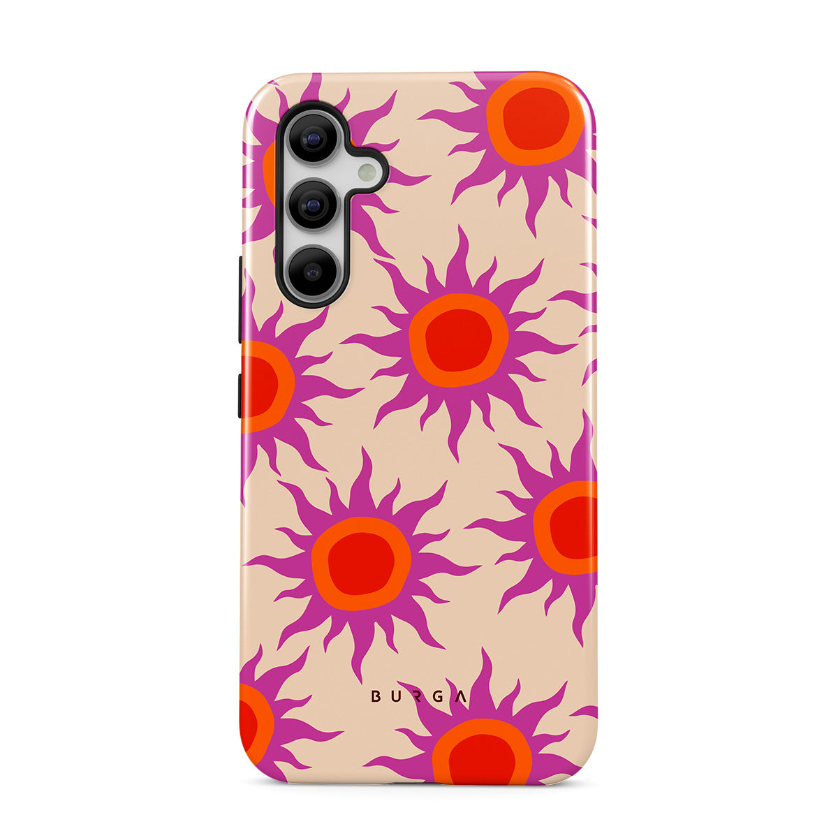 Discover the radiant serenity of the Sunset Glow design, a harmonious blend of soothing pastels and fiery suns. Vivacious viva magenta rays add a playful touch, perfectly balancing tranquility and dynamism. More than just a fashion accessory, this striking Samsung Galaxy A55 phone case mirrors your unique personality and zest for life.