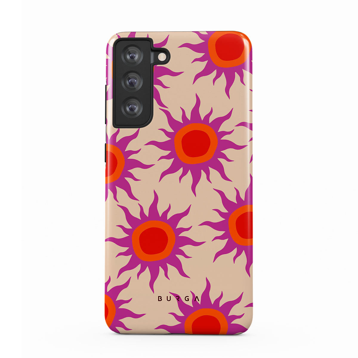 Discover the radiant serenity of the Sunset Glow design, a harmonious blend of soothing pastels and fiery suns. Vivacious viva magenta rays add a playful touch, perfectly balancing tranquility and dynamism. More than just a fashion accessory, this striking Samsung Galaxy S21 FE phone case mirrors your unique personality and zest for life.