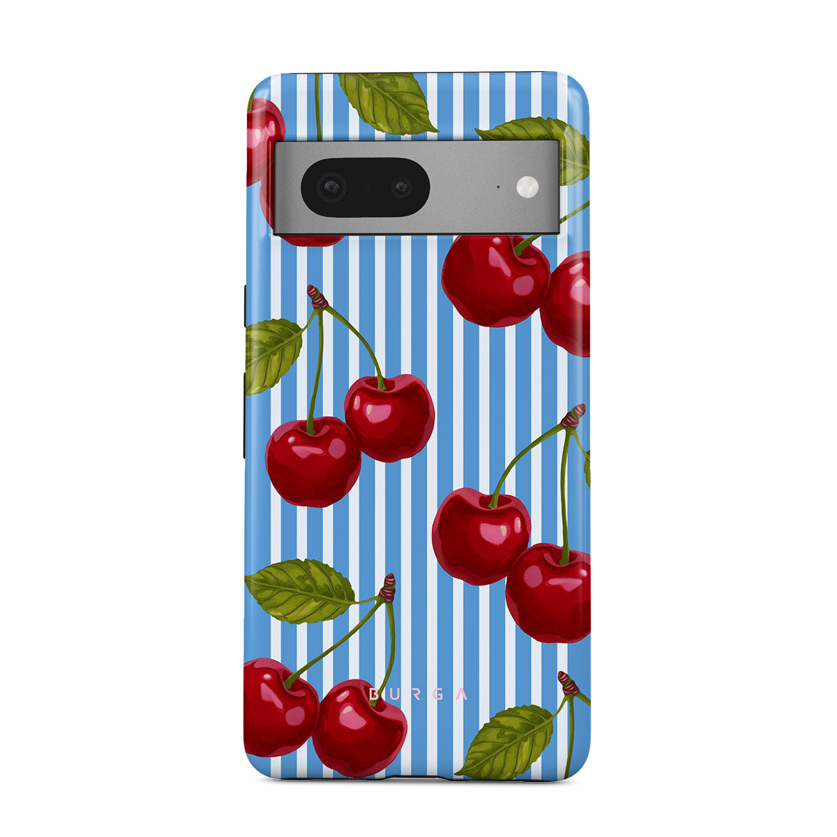 Cherries dangle like earrings from blue skies, a fun reminder of that first bite of summer, juicy and bursting with laughter. Meet our Sweet Moment Google Pixel 7 phone case design.