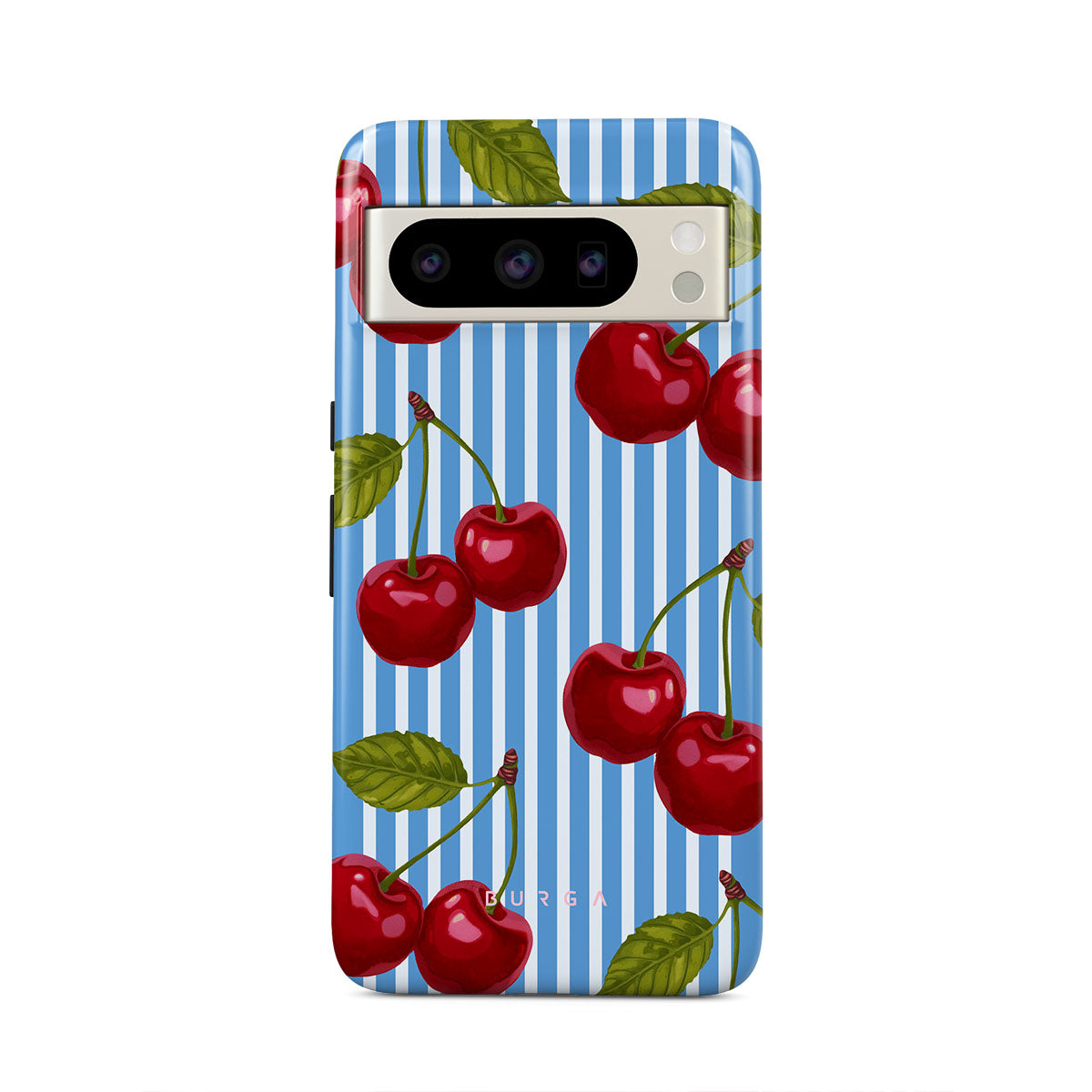 Cherries dangle like earrings from blue skies, a fun reminder of that first bite of summer, juicy and bursting with laughter. Meet our Sweet Moment Google Pixel 8 Pro phone case design.