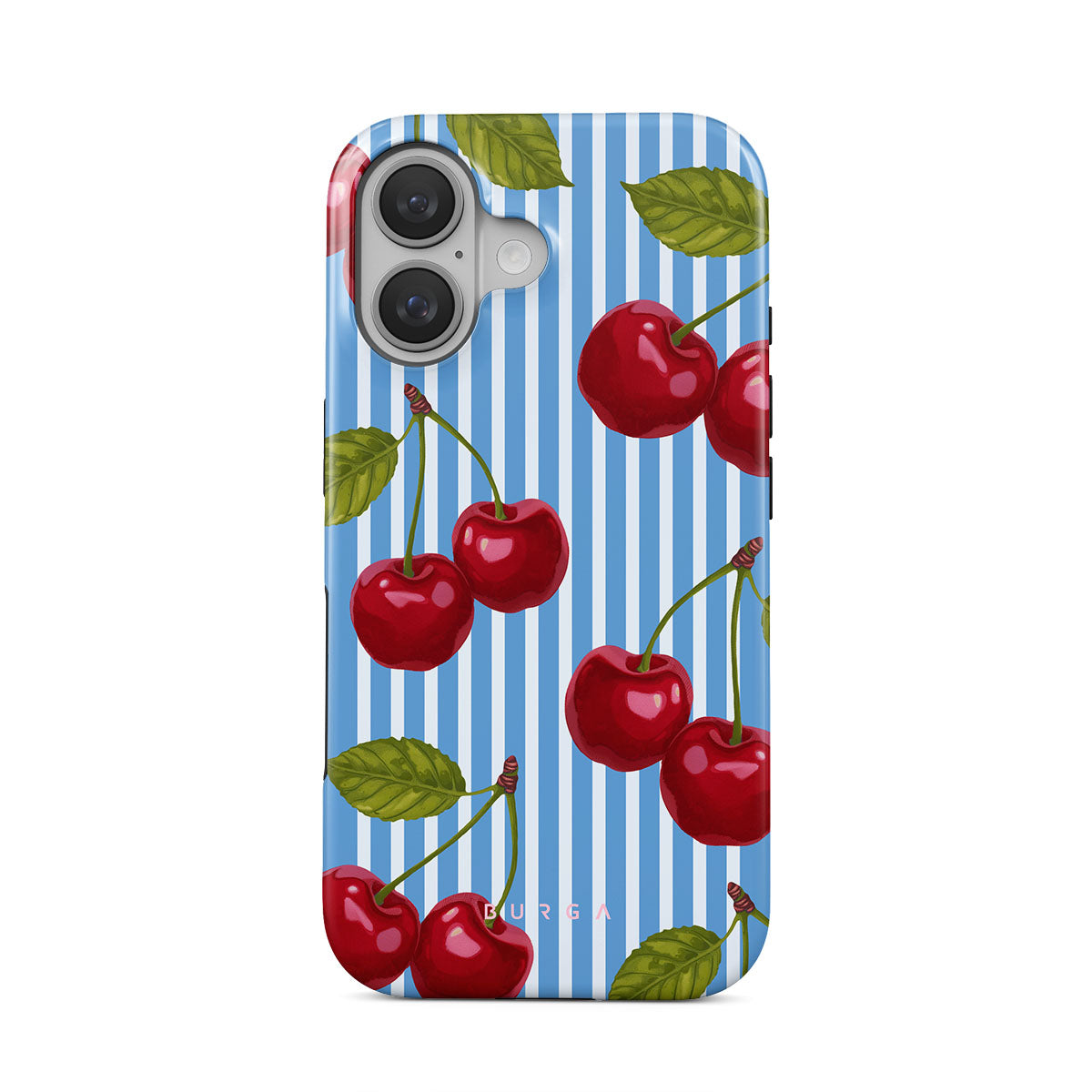 Cherries dangle like earrings from blue skies, a fun reminder of that first bite of summer, juicy and bursting with laughter. Meet our Sweet Moment iPhone 16 Plus phone case design.