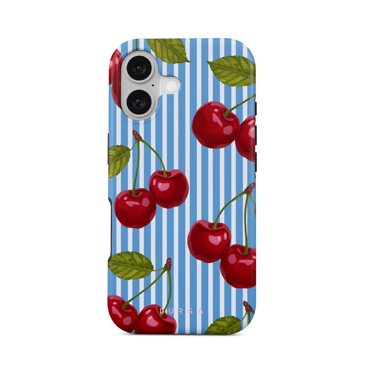 Cherries dangle like earrings from blue skies, a fun reminder of that first bite of summer, juicy and bursting with laughter. Meet our Sweet Moment iPhone 17 phone case design.