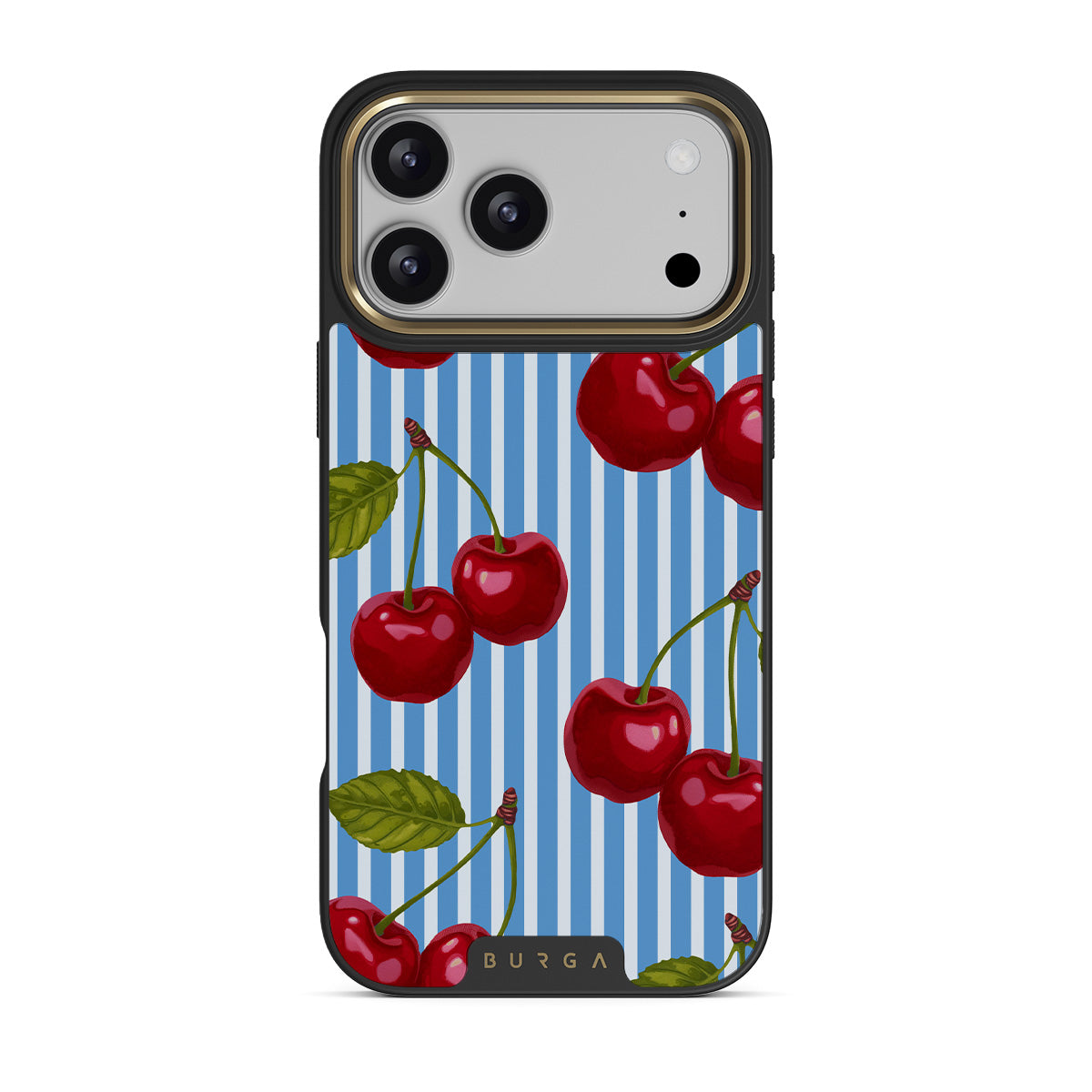 Cherries dangle like earrings from blue skies, a fun reminder of that first bite of summer, juicy and bursting with laughter. Meet our Sweet Moment iPhone 17 Pro Max phone case design.