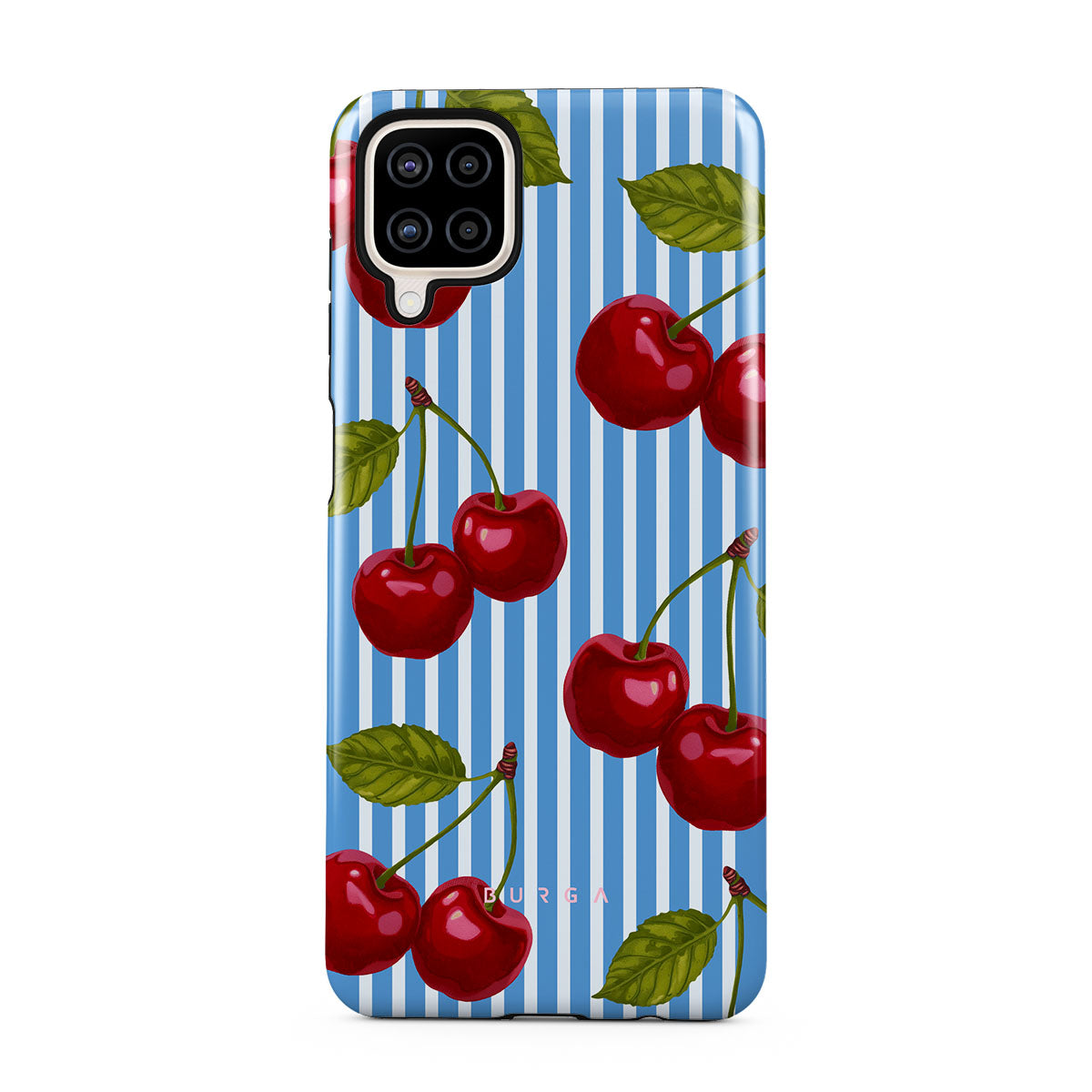 Cherries dangle like earrings from blue skies, a fun reminder of that first bite of summer, juicy and bursting with laughter. Meet our Sweet Moment Samsung Galaxy A12 4G phone case design.