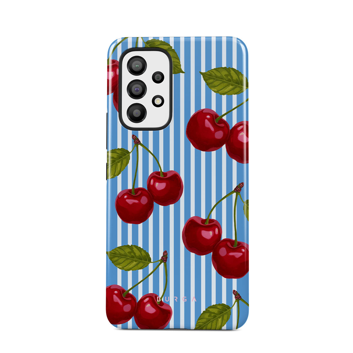 Cherries dangle like earrings from blue skies, a fun reminder of that first bite of summer, juicy and bursting with laughter. Meet our Sweet Moment Samsung Galaxy A33 phone case design.