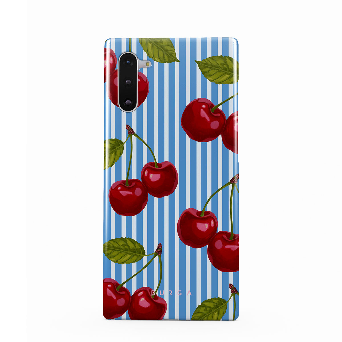 Cherries dangle like earrings from blue skies, a fun reminder of that first bite of summer, juicy and bursting with laughter. Meet our Sweet Moment Samsung Galaxy Note 10 phone case design.