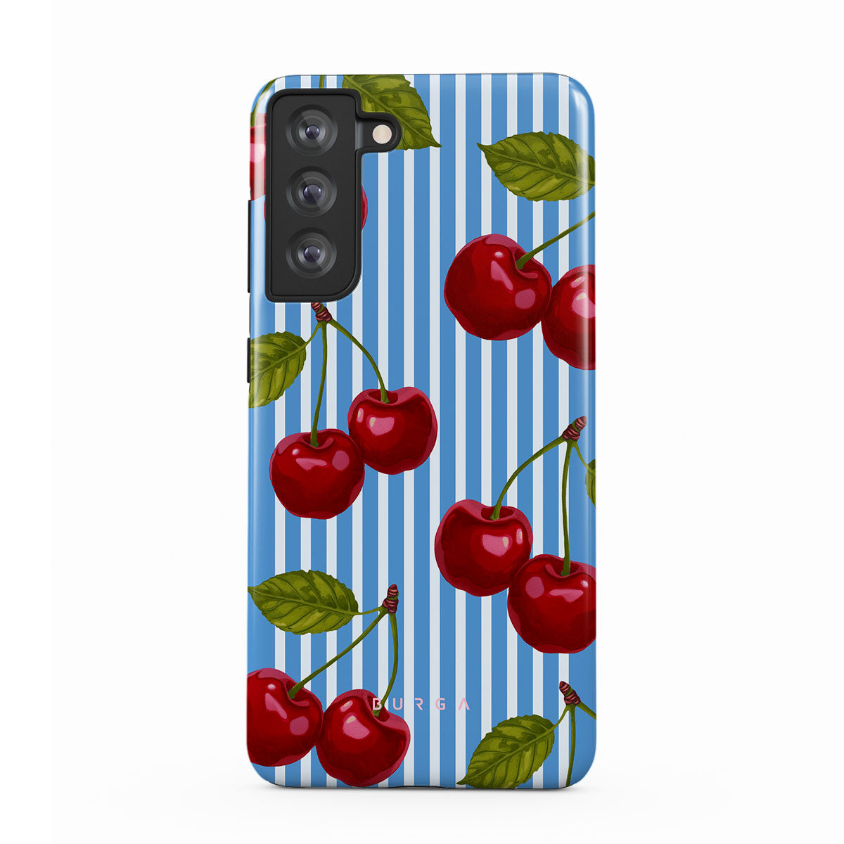 Cherries dangle like earrings from blue skies, a fun reminder of that first bite of summer, juicy and bursting with laughter. Meet our Sweet Moment Samsung Galaxy S21 FE phone case design.