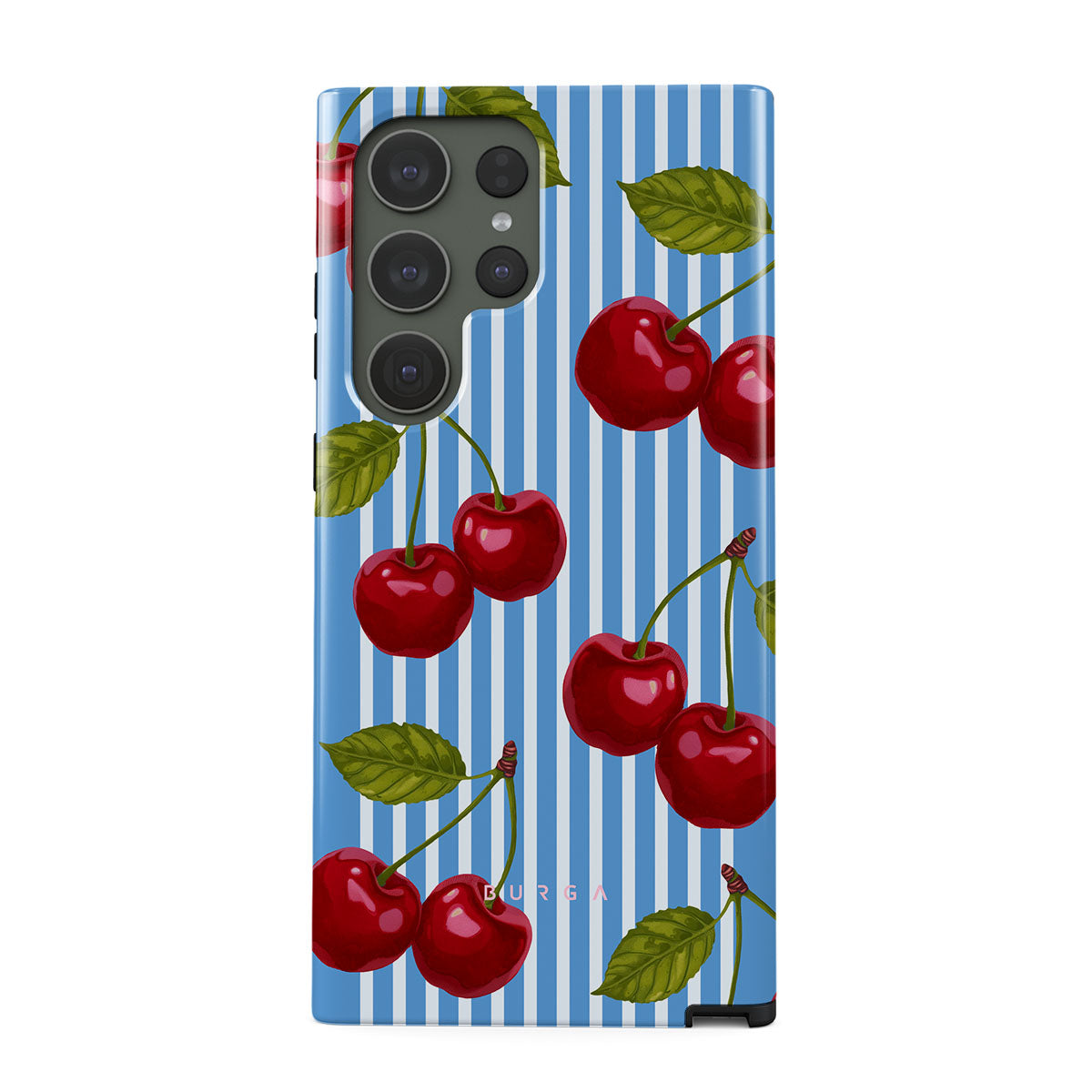 Cherries dangle like earrings from blue skies, a fun reminder of that first bite of summer, juicy and bursting with laughter. Meet our Sweet Moment Samsung Galaxy S23 Ultra phone case design.