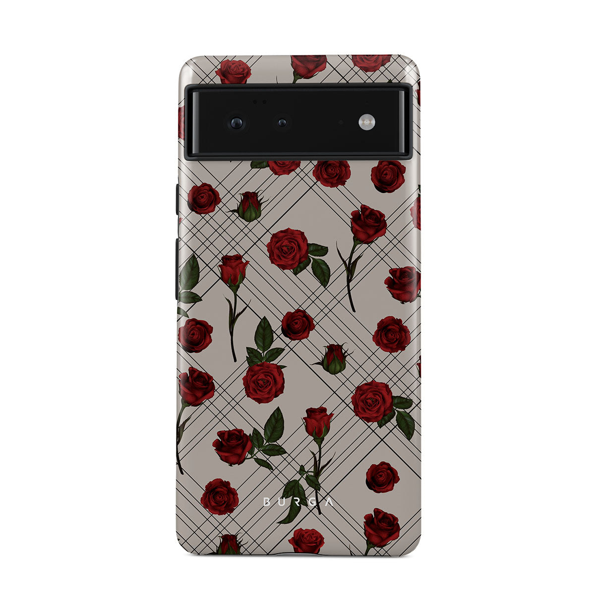 Embrace the subtle rebellion of our Sweet Sin Google Pixel 6 Pro phone case design. On a muted nude-gray canvas, scattered small red roses hint at passions hidden beneath the surface. A design that balances the delicate with the daring. Crafted for those who find beauty in the unexpected and wear their edge with elegance.