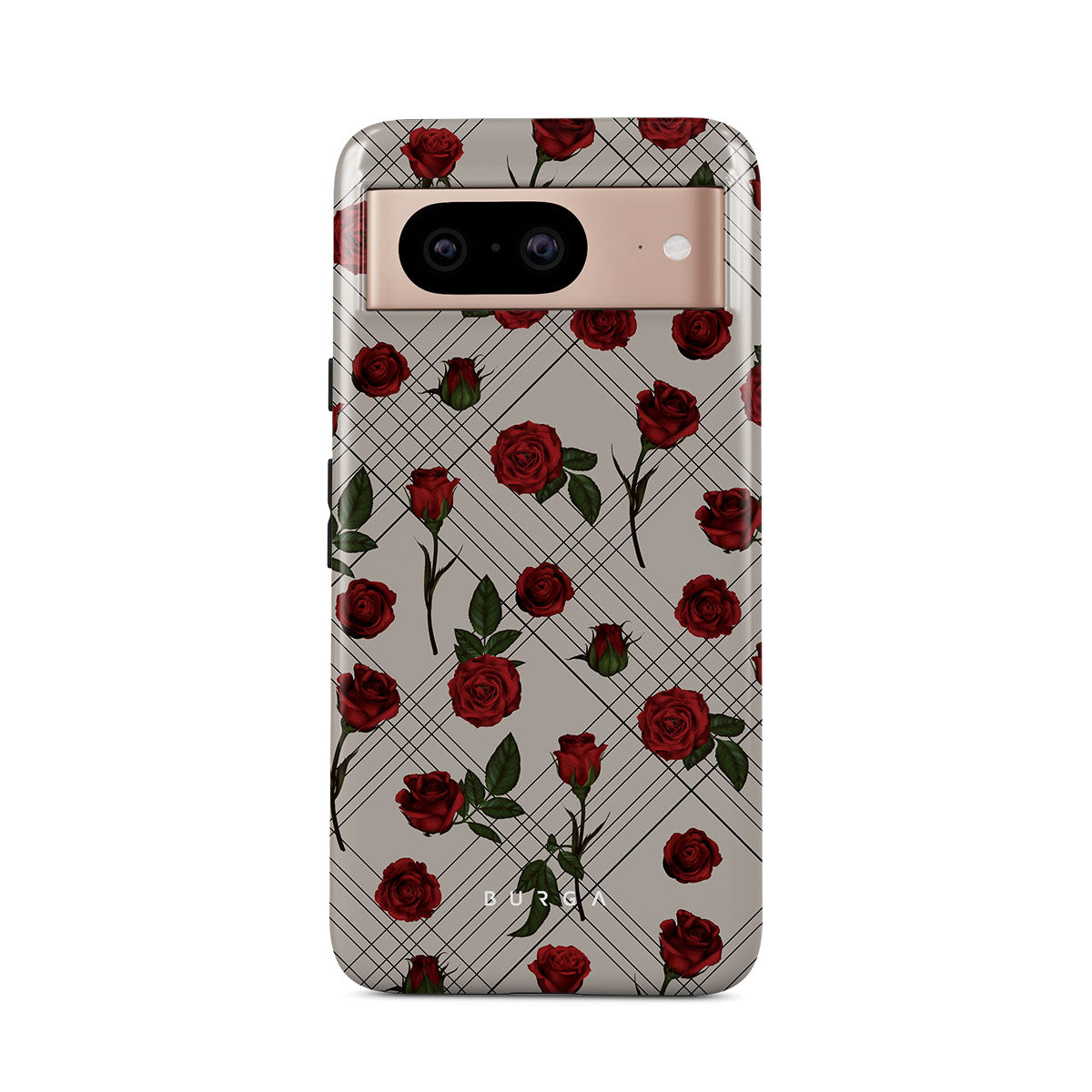 Embrace the subtle rebellion of our Sweet Sin Google Pixel 8 phone case design. On a muted nude-gray canvas, scattered small red roses hint at passions hidden beneath the surface. A design that balances the delicate with the daring. Crafted for those who find beauty in the unexpected and wear their edge with elegance.