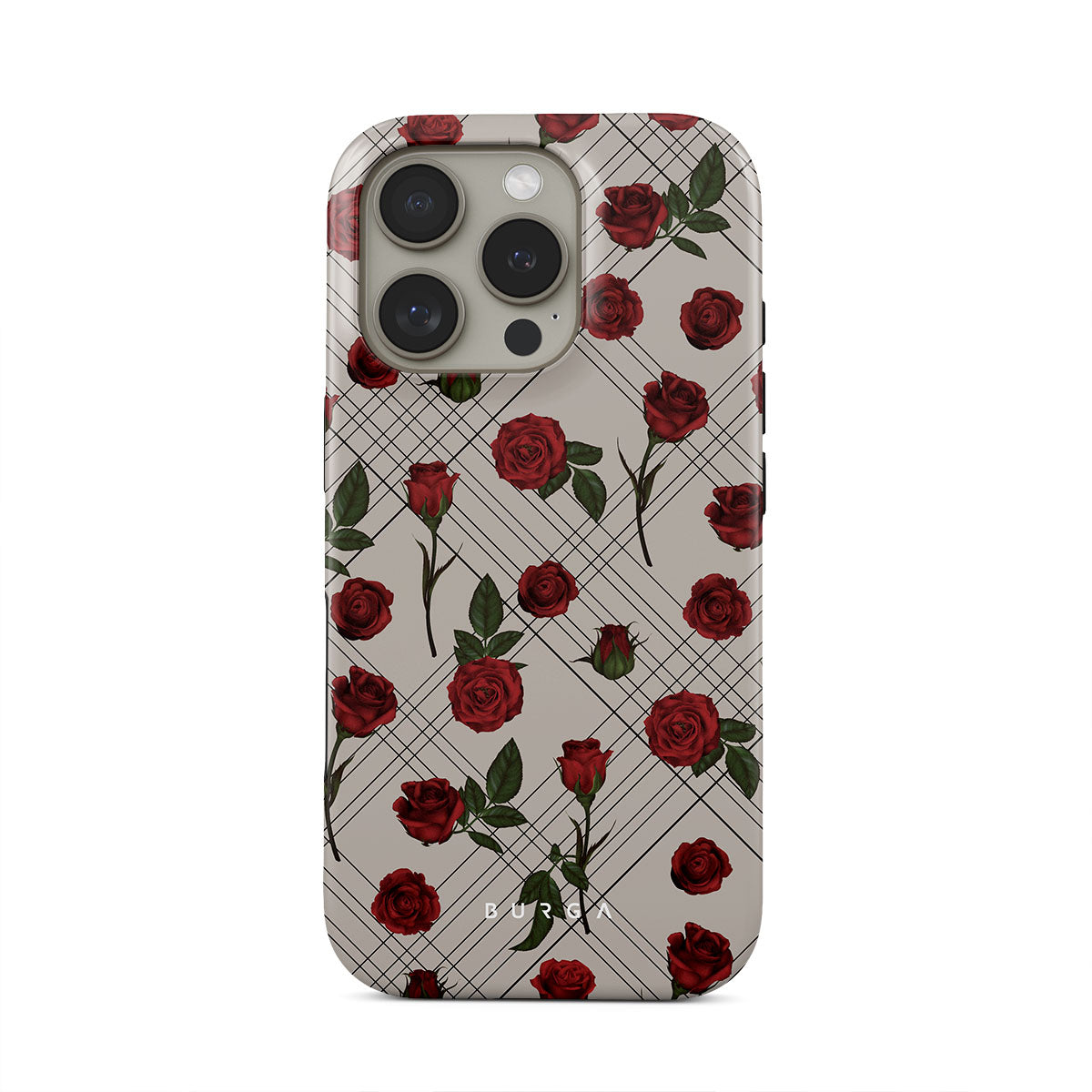 Embrace the subtle rebellion of our Sweet Sin iPhone 16 Pro phone case design. On a muted nude-gray canvas, scattered small red roses hint at passions hidden beneath the surface. A design that balances the delicate with the daring. Crafted for those who find beauty in the unexpected and wear their edge with elegance.