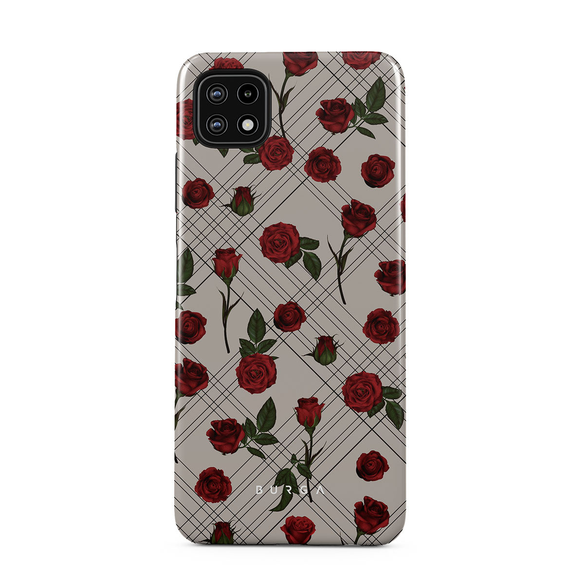 Embrace the subtle rebellion of our Sweet Sin Samsung Galaxy A22 5G phone case design. On a muted nude-gray canvas, scattered small red roses hint at passions hidden beneath the surface. A design that balances the delicate with the daring. Crafted for those who find beauty in the unexpected and wear their edge with elegance.