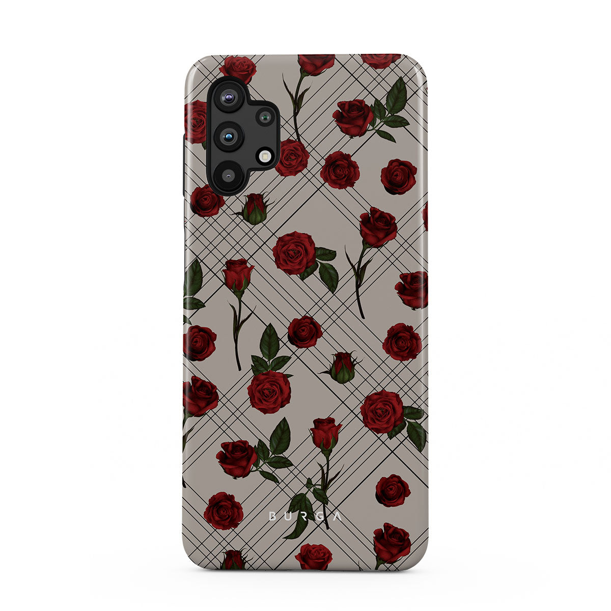 Embrace the subtle rebellion of our Sweet Sin Samsung Galaxy A32 5G phone case design. On a muted nude-gray canvas, scattered small red roses hint at passions hidden beneath the surface. A design that balances the delicate with the daring. Crafted for those who find beauty in the unexpected and wear their edge with elegance.