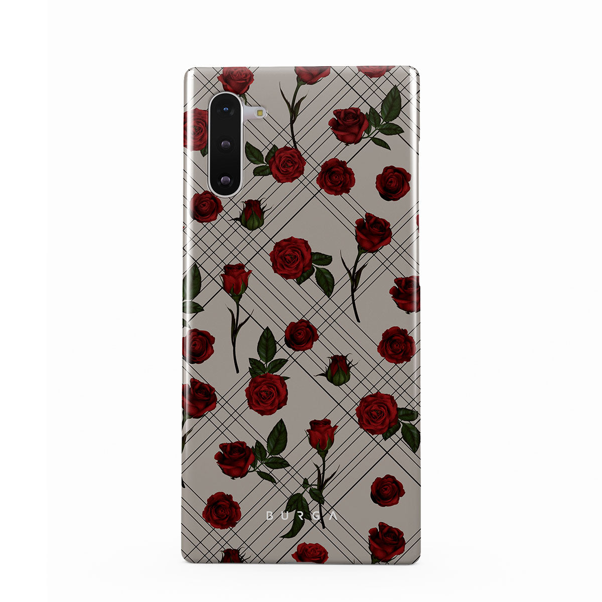 Embrace the subtle rebellion of our Sweet Sin Samsung Galaxy Note 10 phone case design. On a muted nude-gray canvas, scattered small red roses hint at passions hidden beneath the surface. A design that balances the delicate with the daring. Crafted for those who find beauty in the unexpected and wear their edge with elegance.