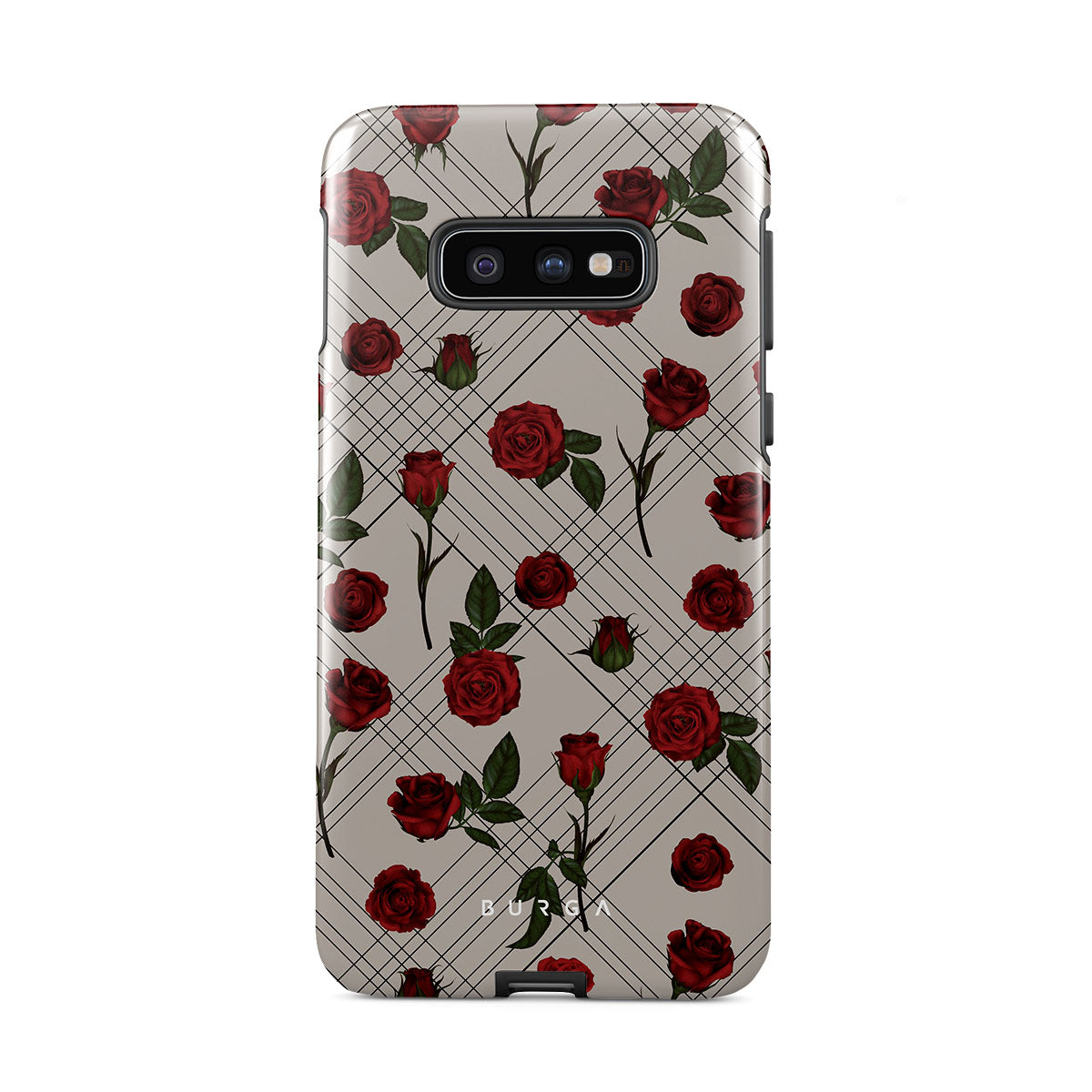Embrace the subtle rebellion of our Sweet Sin Samsung Galaxy S10E phone case design. On a muted nude-gray canvas, scattered small red roses hint at passions hidden beneath the surface. A design that balances the delicate with the daring. Crafted for those who find beauty in the unexpected and wear their edge with elegance.