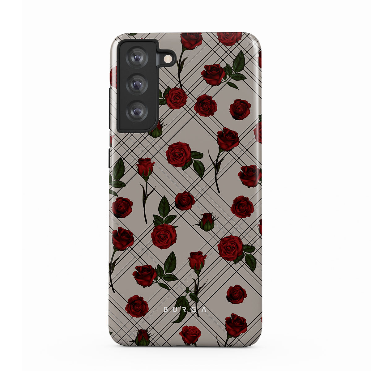 Embrace the subtle rebellion of our Sweet Sin Samsung Galaxy S21 FE phone case design. On a muted nude-gray canvas, scattered small red roses hint at passions hidden beneath the surface. A design that balances the delicate with the daring. Crafted for those who find beauty in the unexpected and wear their edge with elegance.