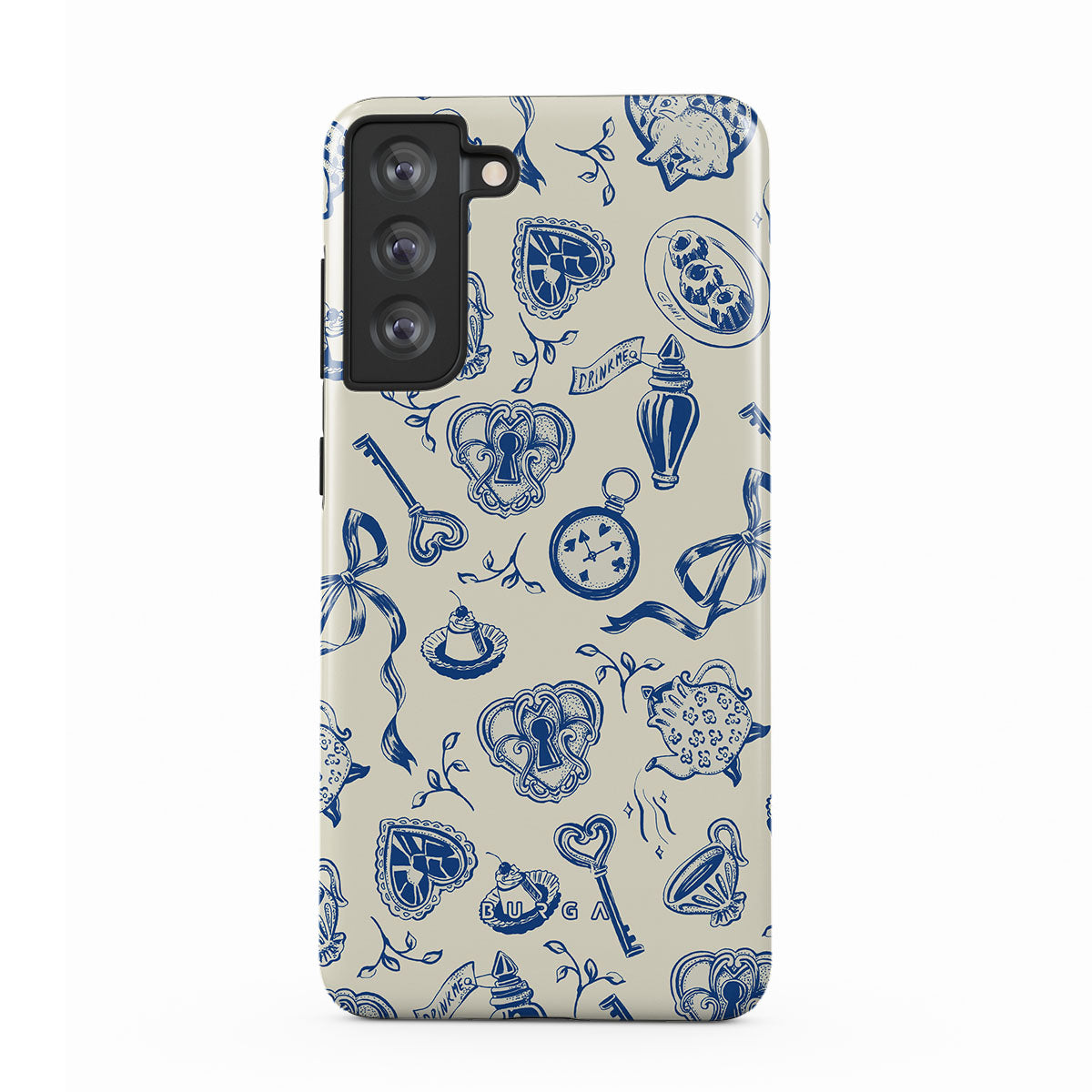 The Tea Party Samsung Galaxy S21 FE phone case design is a porcelain puzzle—ribbons tangled, time warped, rules rewritten. Sit down, pour a cup, but don’t expect things to make sense. They never do.