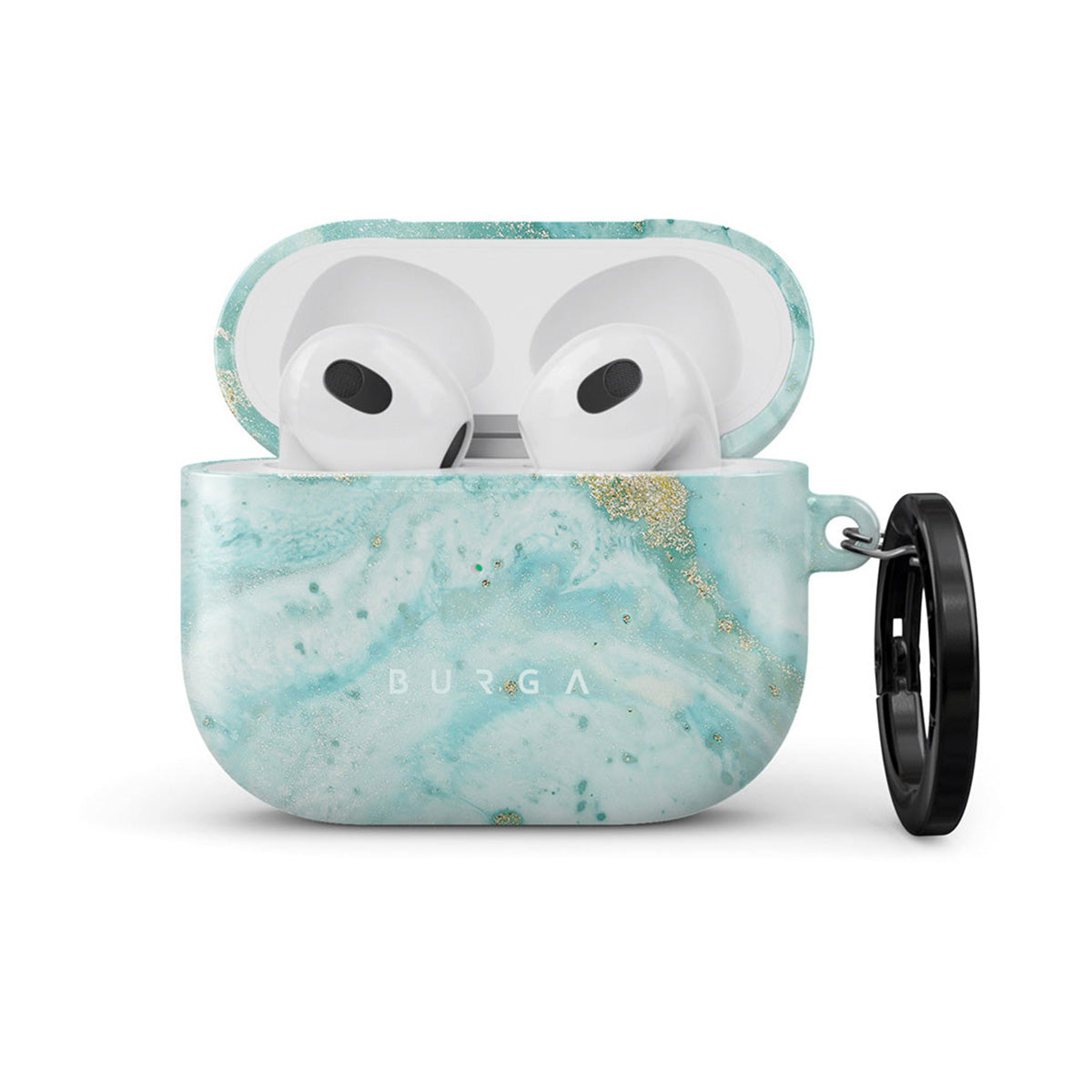 The Uluwatu Waves Apple Airpods 3 case cover features a teal marble pattern enriched with golden color specks that will surely remind you of tropical beach and teal water while offering complete coverage protection and becoming a best friend for your AirPods case Our case fits perfectly snug around Apple Airpods 3 . “Like a glove!” one might say. And it won’t disrupt the wireless charging capabilities of the newer model. There’s even an LED light indicator to prove it (don’t worry, wired charging still works, too). When fitted, the BURGA case will protect the delicate Apple Airpods 3 case beneath it from scratches, bumps, and drops while remaining scratch-free itself. Our signature design pattern prints are High Quality, and will never peel or fade away- thanks to our unique printing technology. And finally, a handy carabiner is there to make your life easier and more convenient: just snap it around your keys or belt loop and tackle the day head-on. Your music is right there by your side when you need it.