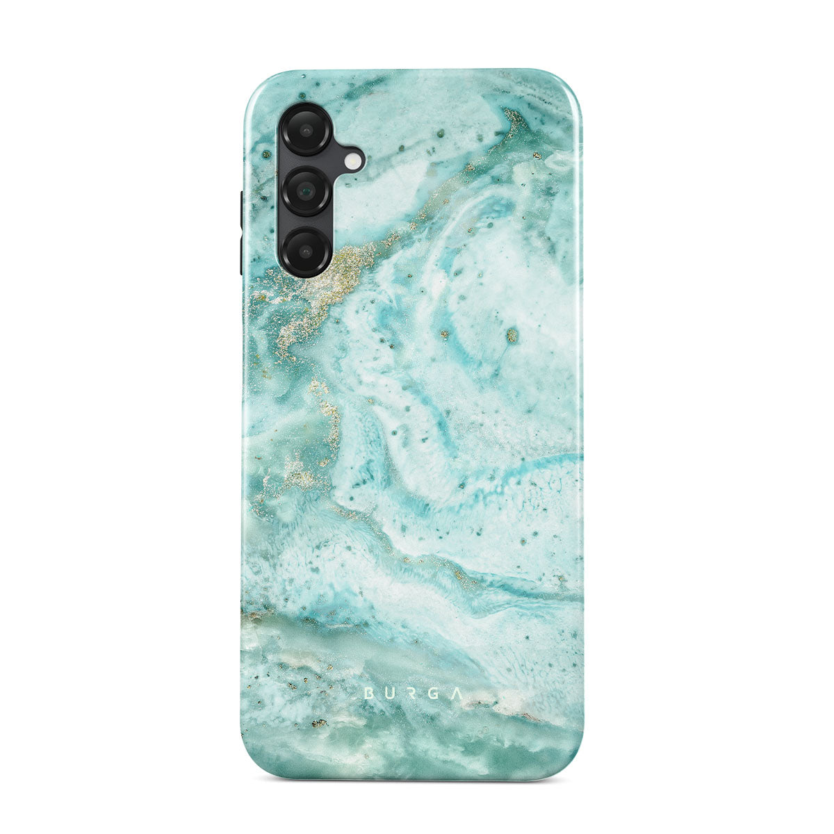 Our Uluwatu Waves Samsung Galaxy A25 phone case is an absolute teal dream. This phone cover features timeless and soft blue marble pattern enriched with golden color specks will surely remind you of a tropical beach teal waters while becoming a protective best friend for your cell phone.