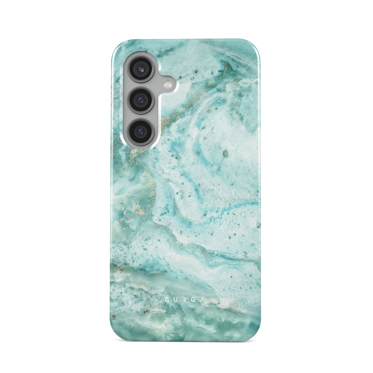Our Uluwatu Waves Samsung Galaxy S24 Plus phone case is an absolute teal dream. This phone cover features timeless and soft blue marble pattern enriched with golden color specks will surely remind you of a tropical beach teal waters while becoming a protective best friend for your cell phone.