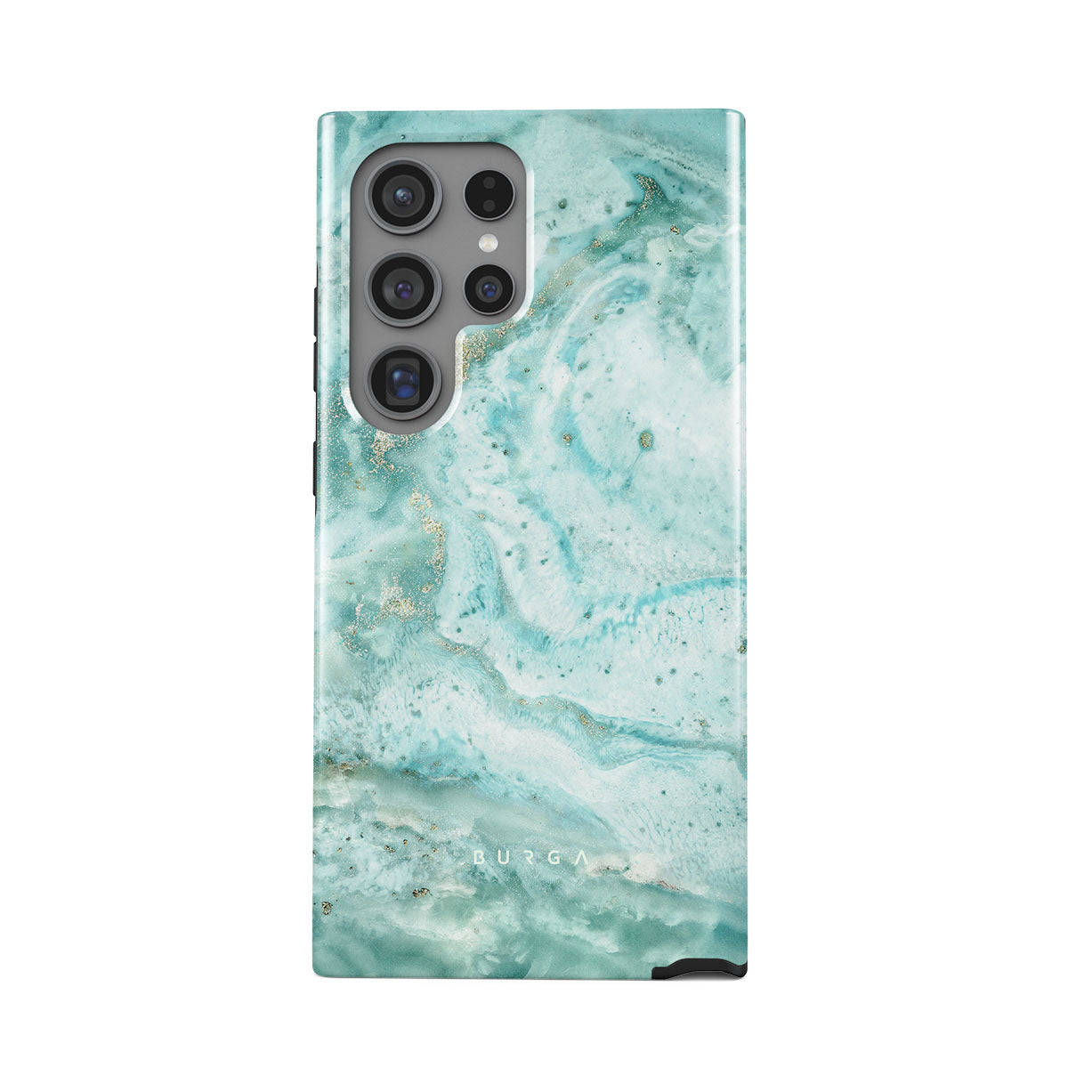 Our Uluwatu Waves Samsung Galaxy S24 Ultra phone case is an absolute teal dream. This phone cover features timeless and soft blue marble pattern enriched with golden color specks will surely remind you of a tropical beach teal waters while becoming a protective best friend for your cell phone.